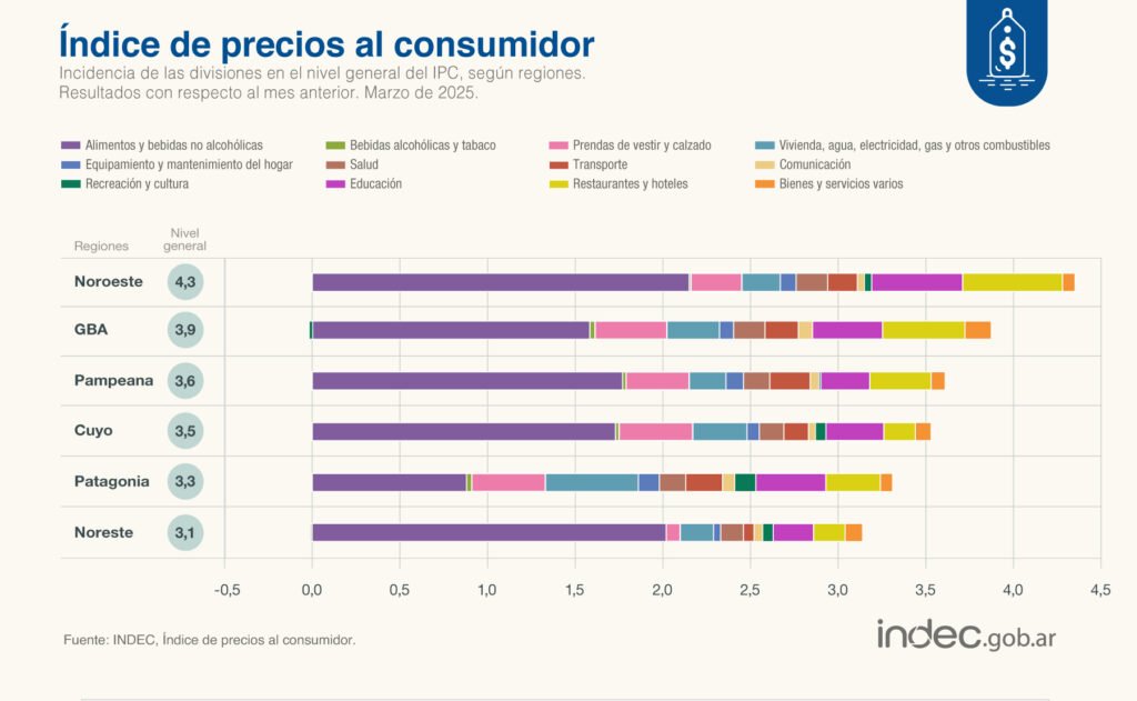 Alimentos y bebidas no alcohólicas volvió a ser el rubro con mayor incidencia en todas las regiones del país. En promedio, este segmento registró una suba del 5,9%, con especial presión de los productos frescos. En el Gran Buenos Aires, por ejemplo, las verduras escalaron más de un 39%.